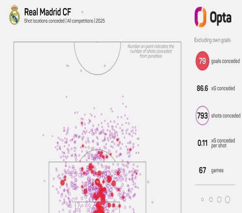 根据OPTA最新数据统计,皇家马德里在2025年各项赛事中已累计失球80个,在欧洲五大联赛所有球队中失球数排名第二...