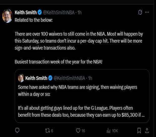 雷速体育10月14报道 名记Keith Smith更新社交媒体,谈到了为什么NBA球队会在签下球员后一天裁掉他们,并提到了本周将会是NBA最繁忙的交易周,一些非保障合同的球员能否留在球队很快就能得到答案。