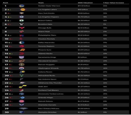在这份榜单统计中,NBA球队的平均估值高达55.1亿美元,相比去年提升了20%,相比2022年提升了113%。