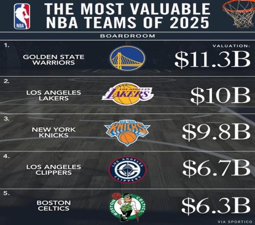 NBA最新市值排行:勇士113.3亿美元领跑30队平均市值55.1亿