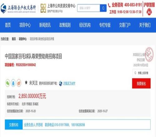 10月27日,据上海联合产权交易所官方消息,中国羽毛球队征集赞助商,三年合作挂牌价2850万元。