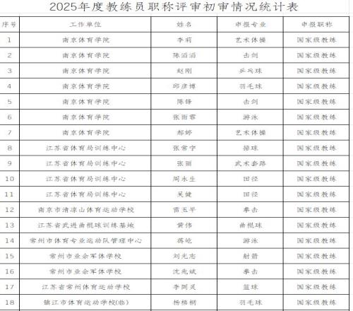 江苏省体育局人事处11月11日发布《2025年体育专业人员职称申报人员名单评前公示》。