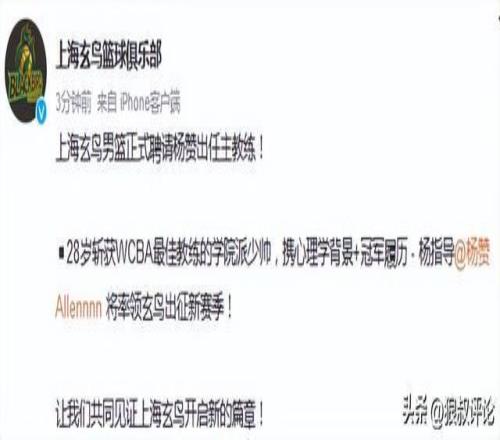 北京时间11月30日,根据上海玄鸟篮球俱乐部公示,28岁斩获WCBA最佳教练的学院派少帅,携心理学背景+冠军履历 - 杨指导将率领玄鸟出征新赛季。