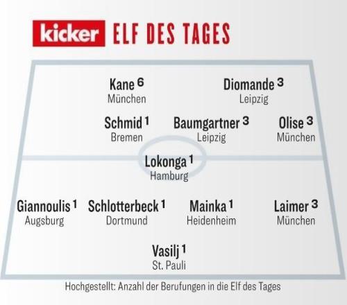 本周一,《踢球者》公布了他们评选的德甲第13轮比赛最佳阵容,其中凯恩、奥利塞、施洛特贝克、莱默尔等人在列。
