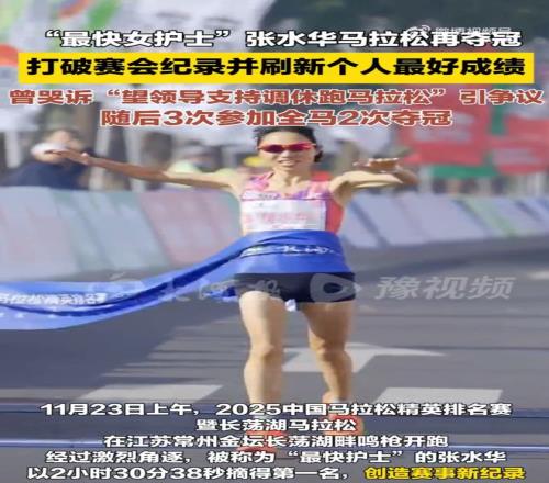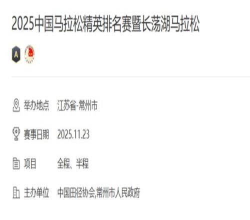 张水华在上个月参加的比赛,并不是“常州马拉松”,在中国马拉松官网上,其全称为:“2025中国马拉松精英排名赛暨长荡湖马拉松”,在江苏省常州进行,但并不以城市命名,通常的简称是“长荡湖马拉松”。