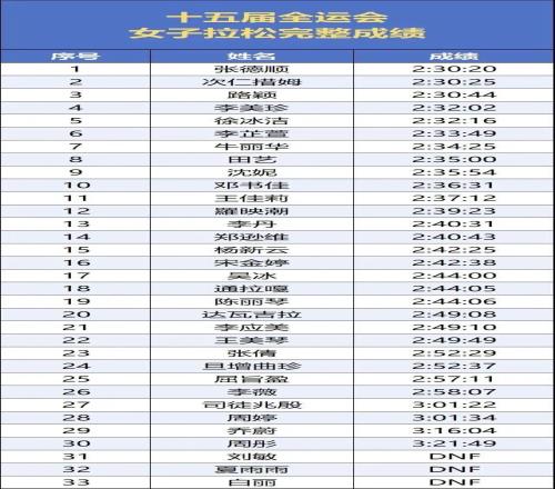 而且值得一提的是,在官方的全运会决赛名单中,PB在2小时30分以内的有12人,2小时33分以内的有19人,张水华的成绩在其中并不算多特别。这些获得参赛资格的专业选手,因为全运会年的缘故,并没有大量出现在城市马拉松赛场,但她们的水平有目共睹。