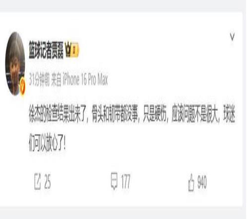 那么说徐杰现在伤情怎么样了?不妨来看看篮球记者贾磊的报道,赛后第一时间,贾磊就公布了徐杰的最新伤情报告,好消息是,徐杰的骨头和韧带都没事,只是硬伤,贾师傅认为徐杰应该问题不是很大,球迷们可以放心了!