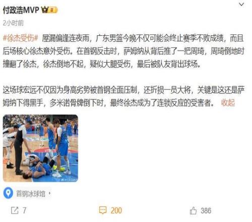 确实,尽管今晚的比赛萨姆纳轰下35分是撑起广东队前三节主要得分的功臣,场上表现确实无可争议,攻防两端也确实足够拼,他也在第四节拼到了受伤下场,态度上没的说,但有一说一,徐杰的受伤确实和他分不开关系,这个锅只能由萨姆纳来背。