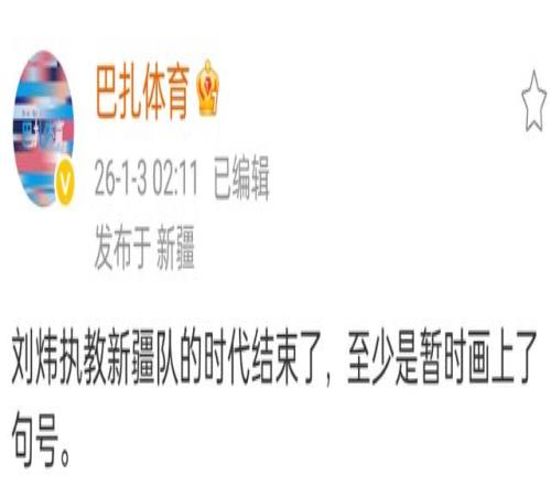 主帅击败广州龙狮让刘炜得到了喘息的机会,然而客场惨败给山东男篮,让刘炜失去了最后的稻草,根据新疆媒体透露,新疆男篮已经进行了调整,刘炜会暂时离开球队,姜正秀成为代理主帅,但目前新疆男篮没有进行回应。