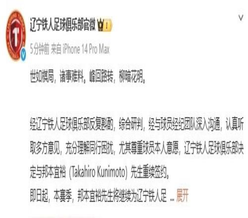 辽宁铁人在官方公告中,对于重新签下邦本宜裕解释道:经俱乐部反复斟酌,综合研判,经与球员经纪团队深入沟通,认真听取多方意见,充分理解同行困扰,尤其尊重球员本人意愿,辽宁铁人决定与日本外援邦本宜裕重续签约。