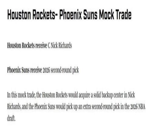 结合火箭队的需求,美媒《体育画报》果断建议休城1换1拿下太阳队的理查兹。