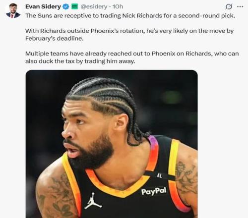 名记Evan Sidery曝出,太阳队考虑用理查兹换一枚二轮签,以帮助球队彻底避开奢侈税。