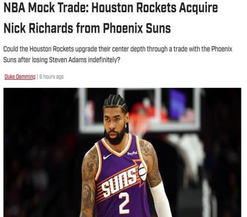 亚当斯重伤无限期缺阵后,休赛期曾8换1杜兰特实现双赢的火箭与太阳应该再次在交易截止日前合作?美媒建议休城1换1拿下在太阳队郁郁不得志的理查兹。